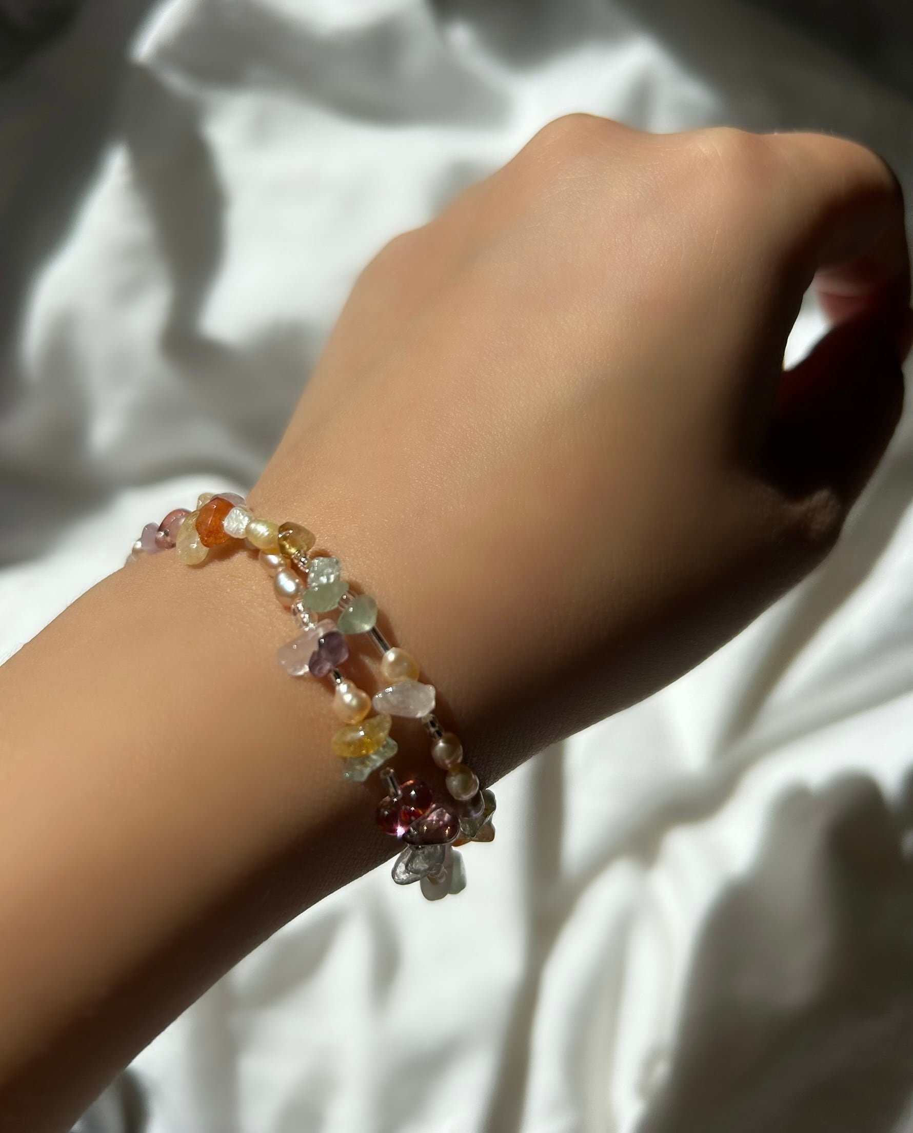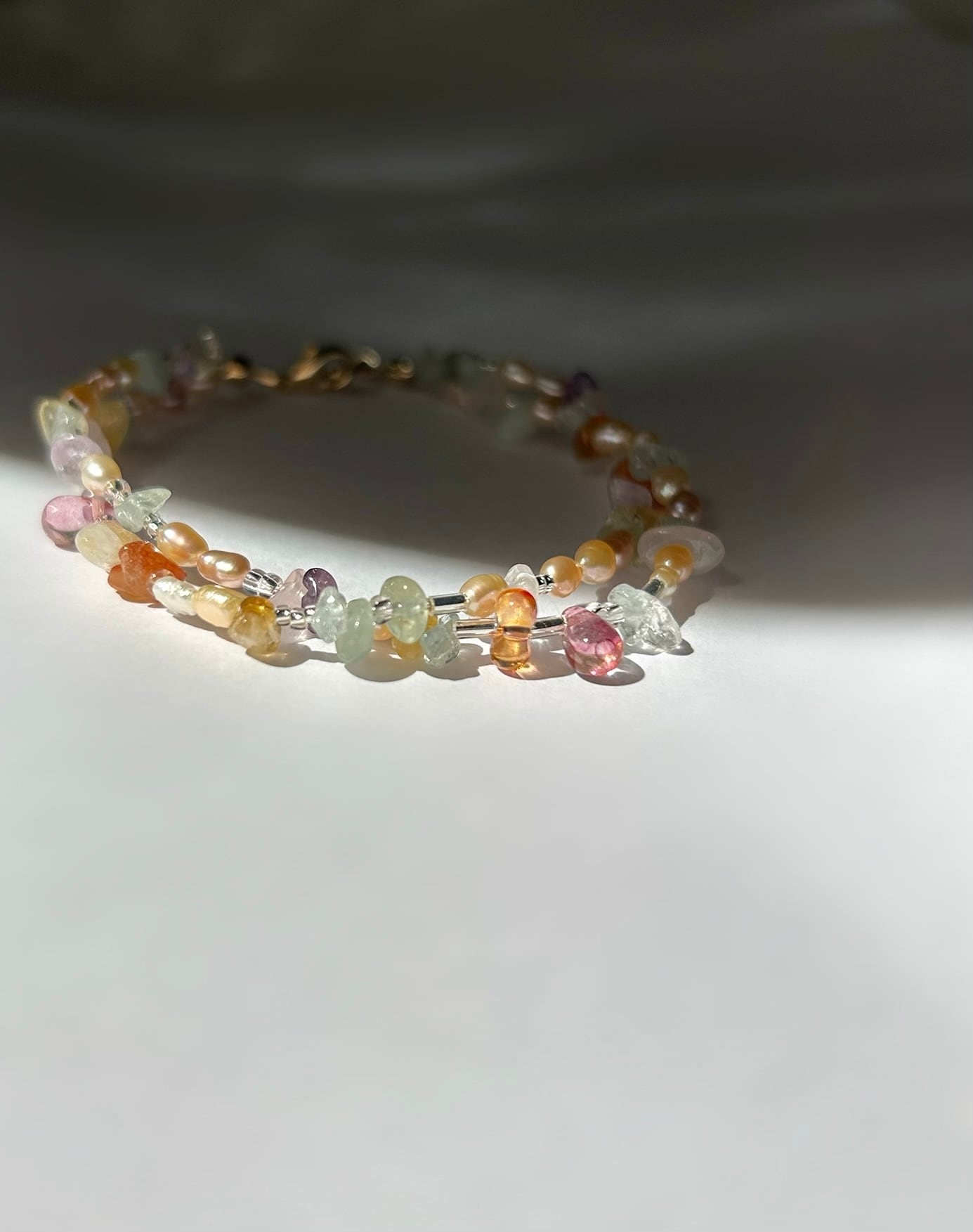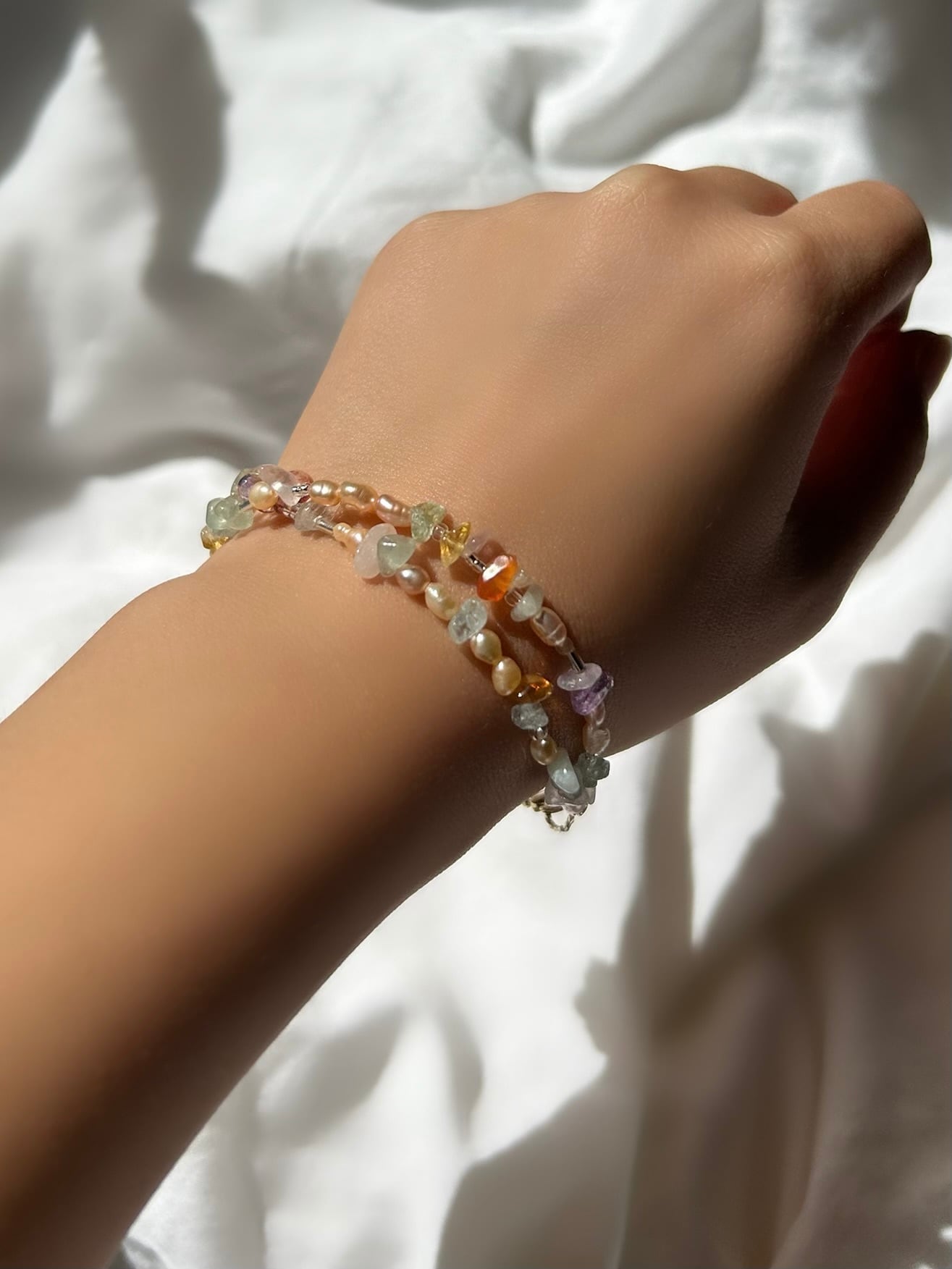 9種の天然石をふんだんに使用し、虹のようなカラフルでhappyな色合いのブレスレットに仕上げました。