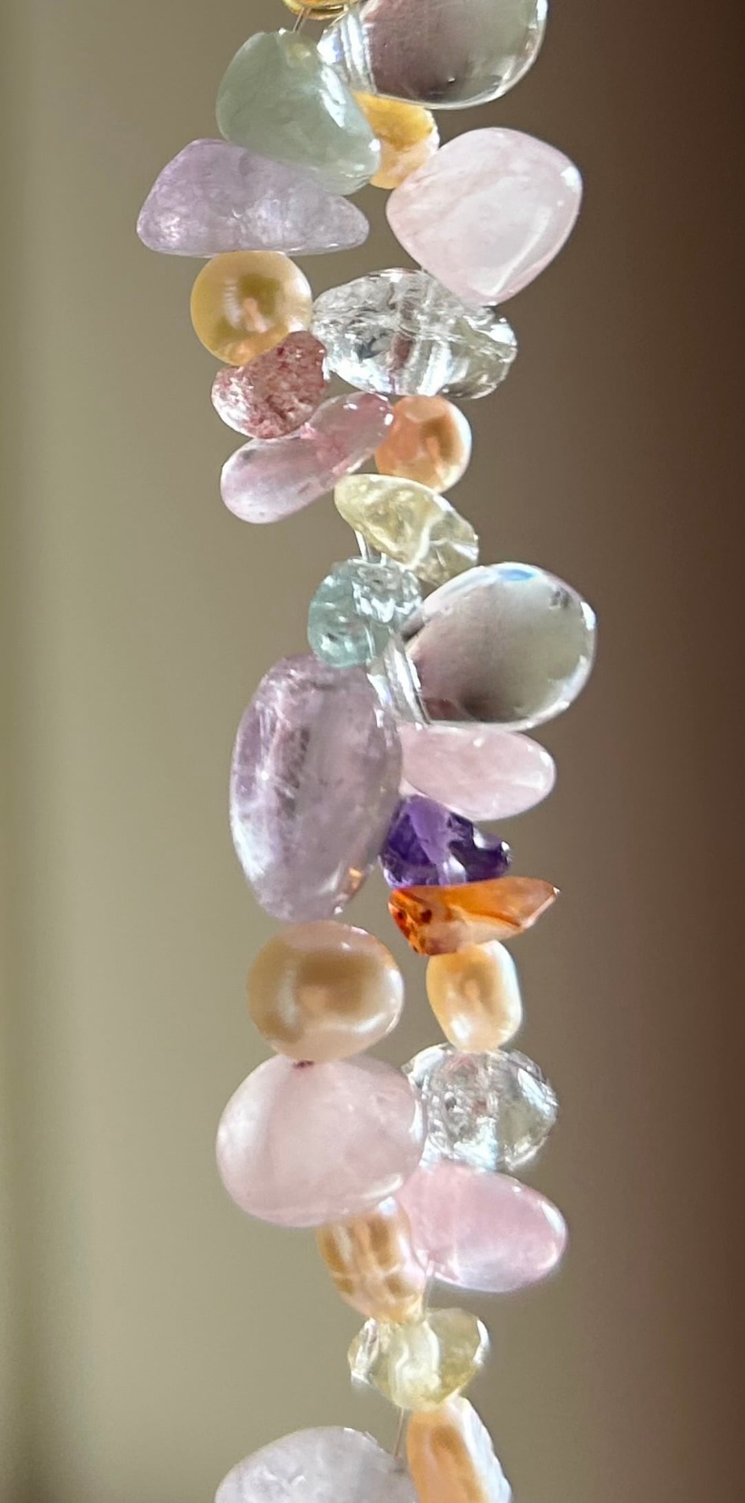 マダガスカルローズクォーツやラベンダーアメジストをメインに使用したカラフルで花畑のようなブレスレットに仕上げました。