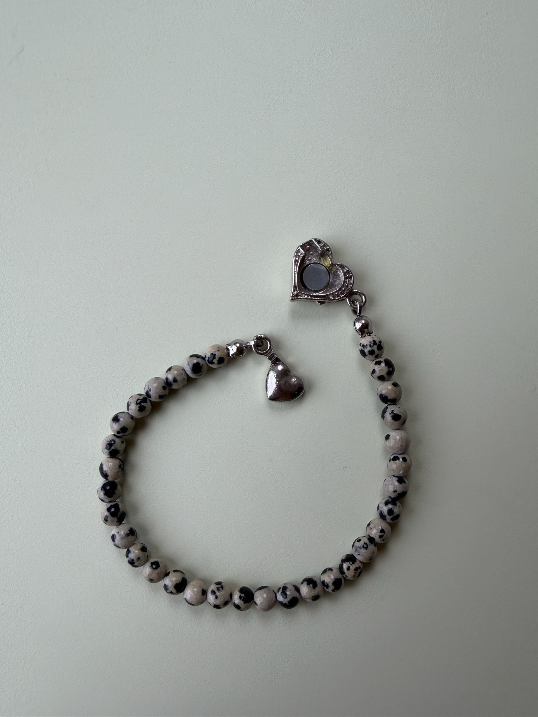小粒のダルメシアンジャスパーとマグネットのシルバーハートがポイントのシンプルなブレスレットです。