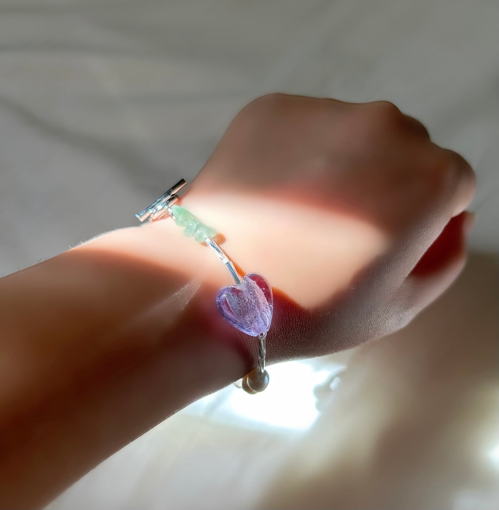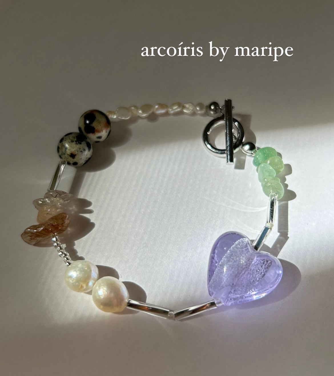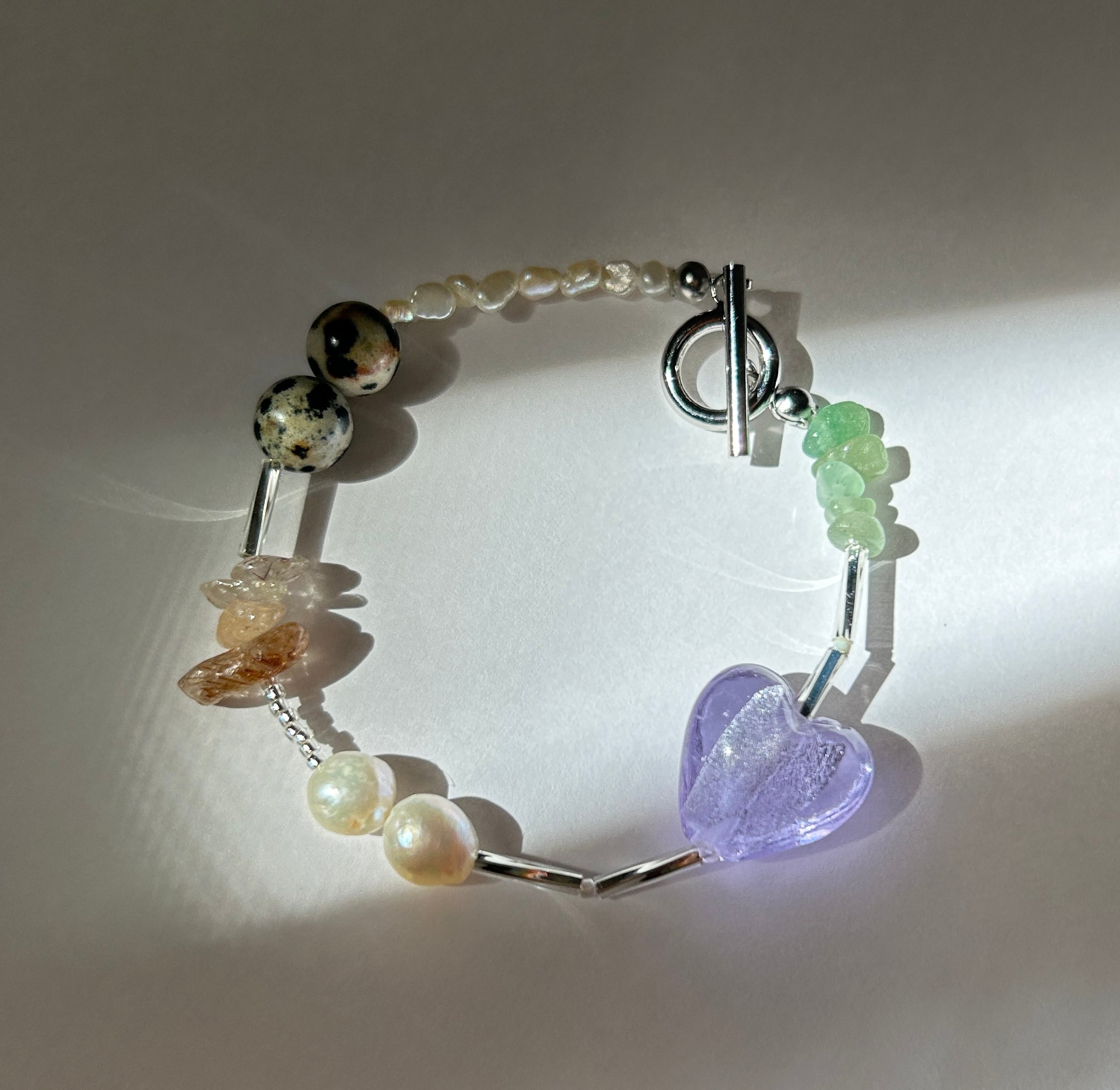 定番のガラスハートにダルメシアンジャスパーを合わせ、個性的なブレスレットに仕上げました。