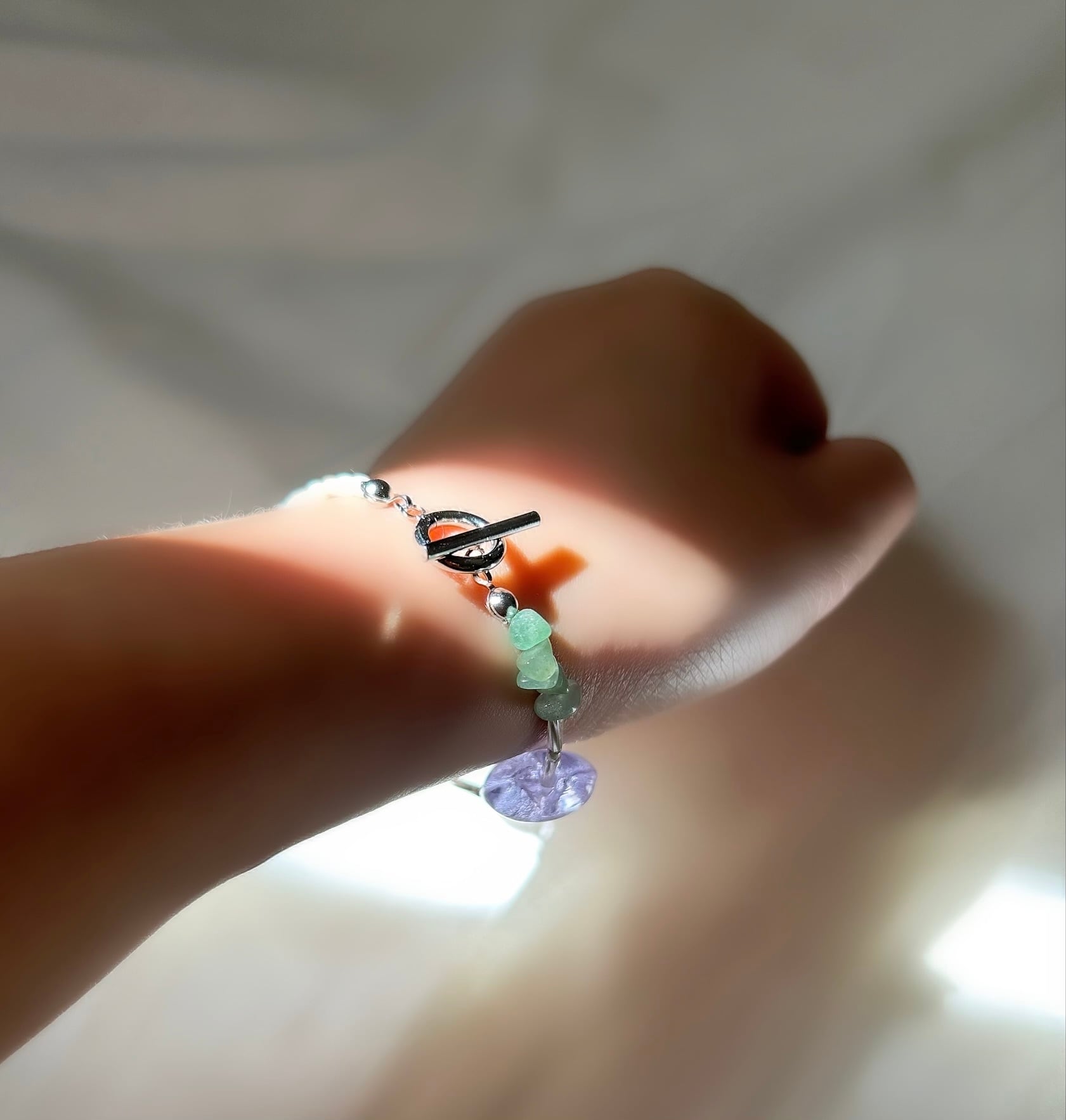 色彩の調和を大切に、グリーンアベンチュリンに加え、青緑系の天然石を組み合わせることがあります。